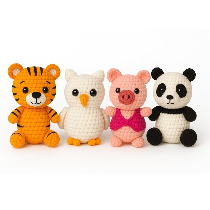 + Free Shipping- Premium Quality Amigurumi Set: Includes 4 adorable, handcrafted crochet animals: a Tiger, an Owl, a Pig, and a Panda.