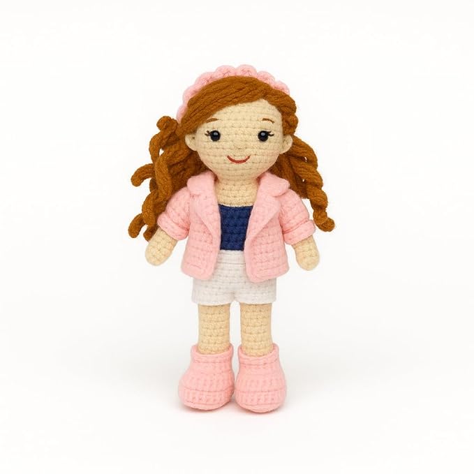 - 💗 Stylish Pink Outfit: Adorned in a pink crochet jacket, white skirt, and matching pink boots – bringing a modern touch to classic handmade design.