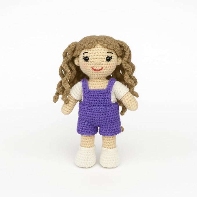 - 💜 Cute Overall Design: Features a white crochet top paired with purple overalls and matching shoes — cheerful, stylish, and full of handmade charm.