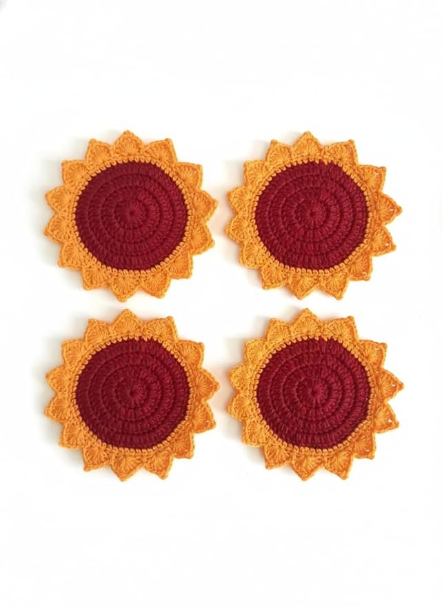 + Free Shipping- HANDCRAFTED DESIGN: Each sunflower coaster is lovingly handmade with crochet technique, featuring a vibrant burgundy centre surrounded by cheerful golden-orange petals that add a charming floral accent to your home